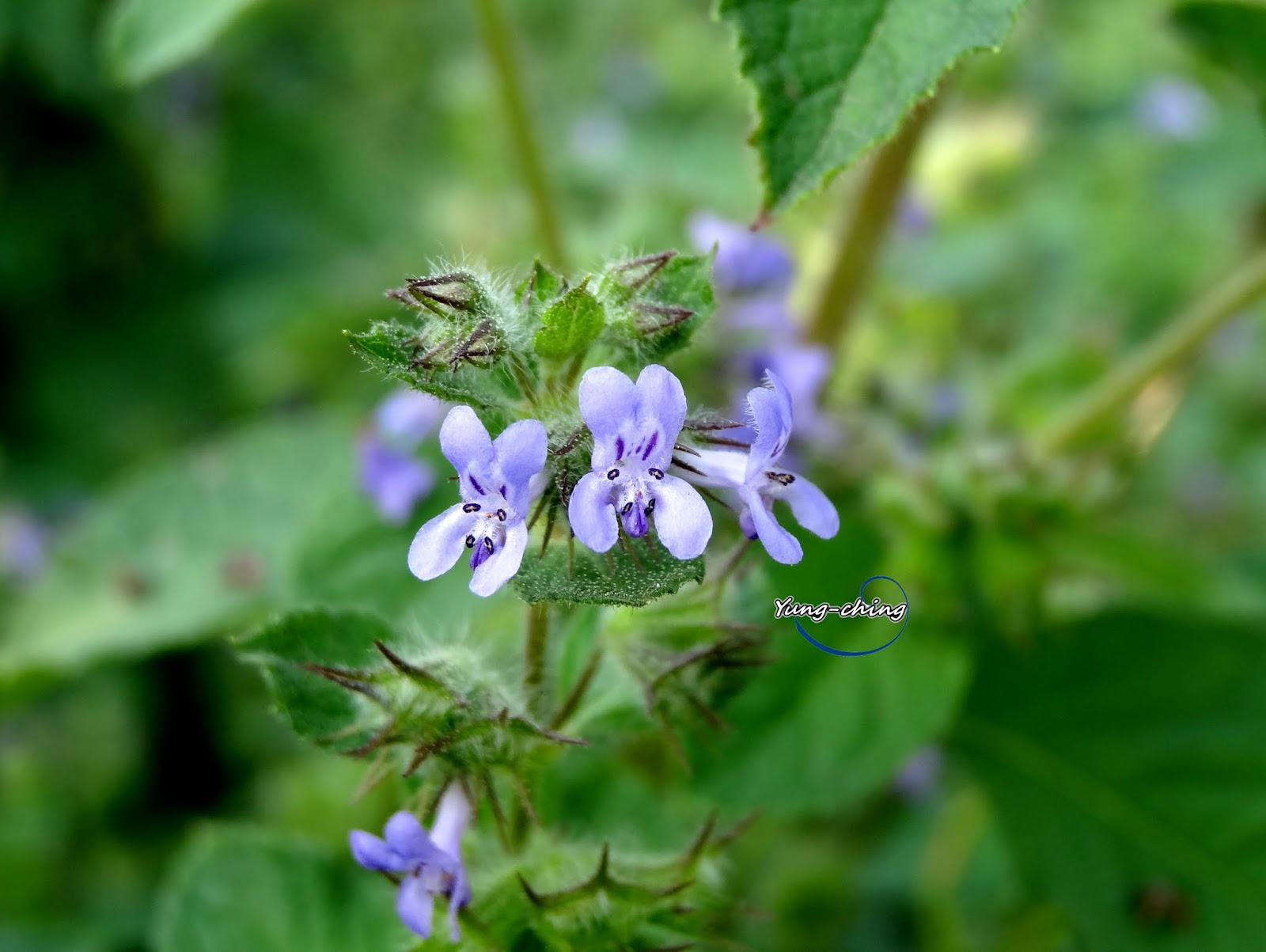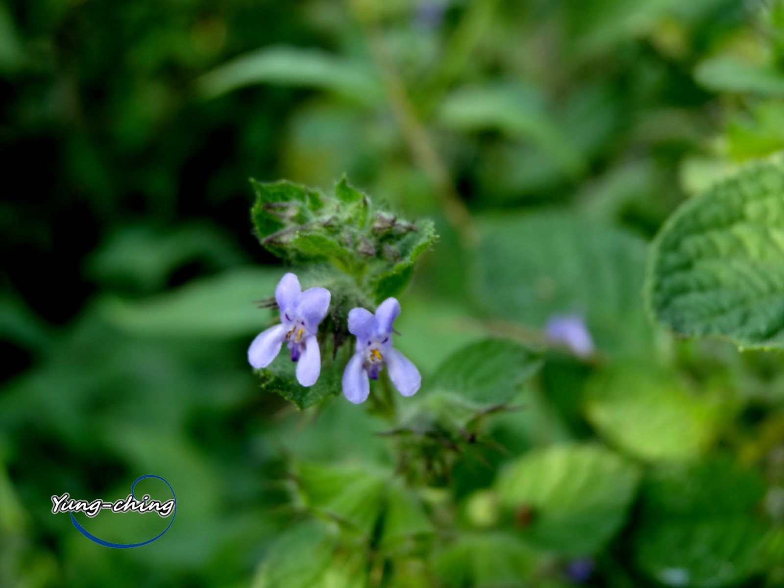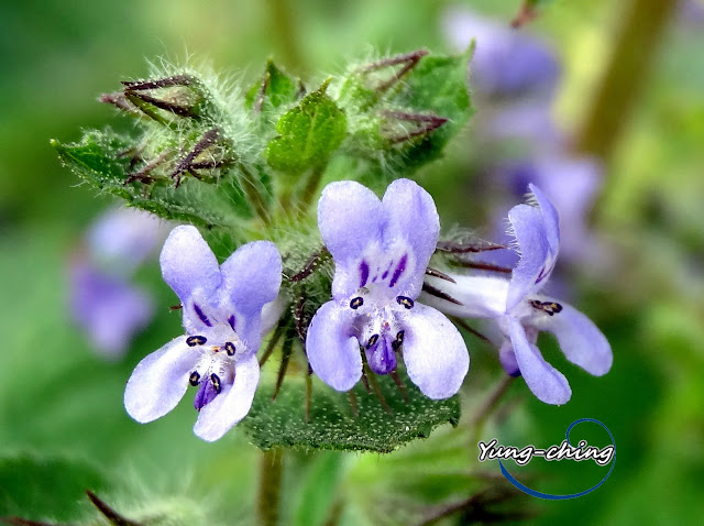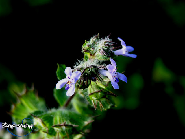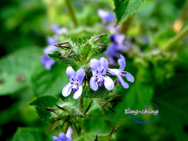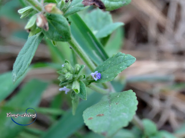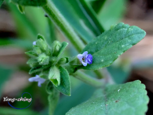 直立;花冠二唇形,藍色,長 0.6~0.8 公分,上唇 2 圓裂,裂片外反,