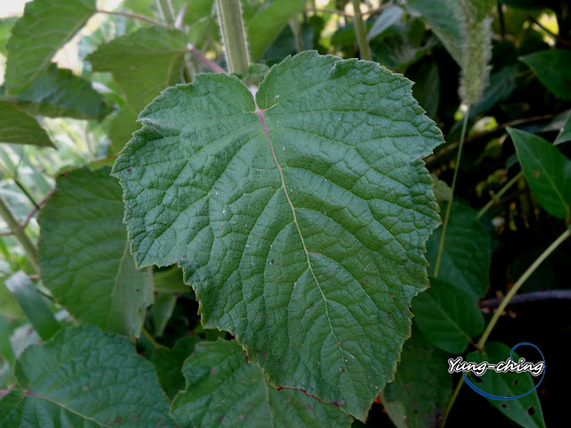 基部渾圓或淺心形,葉尖鈍形,邊緣細鋸齒狀,兩面均被疏柔毛和腺點。