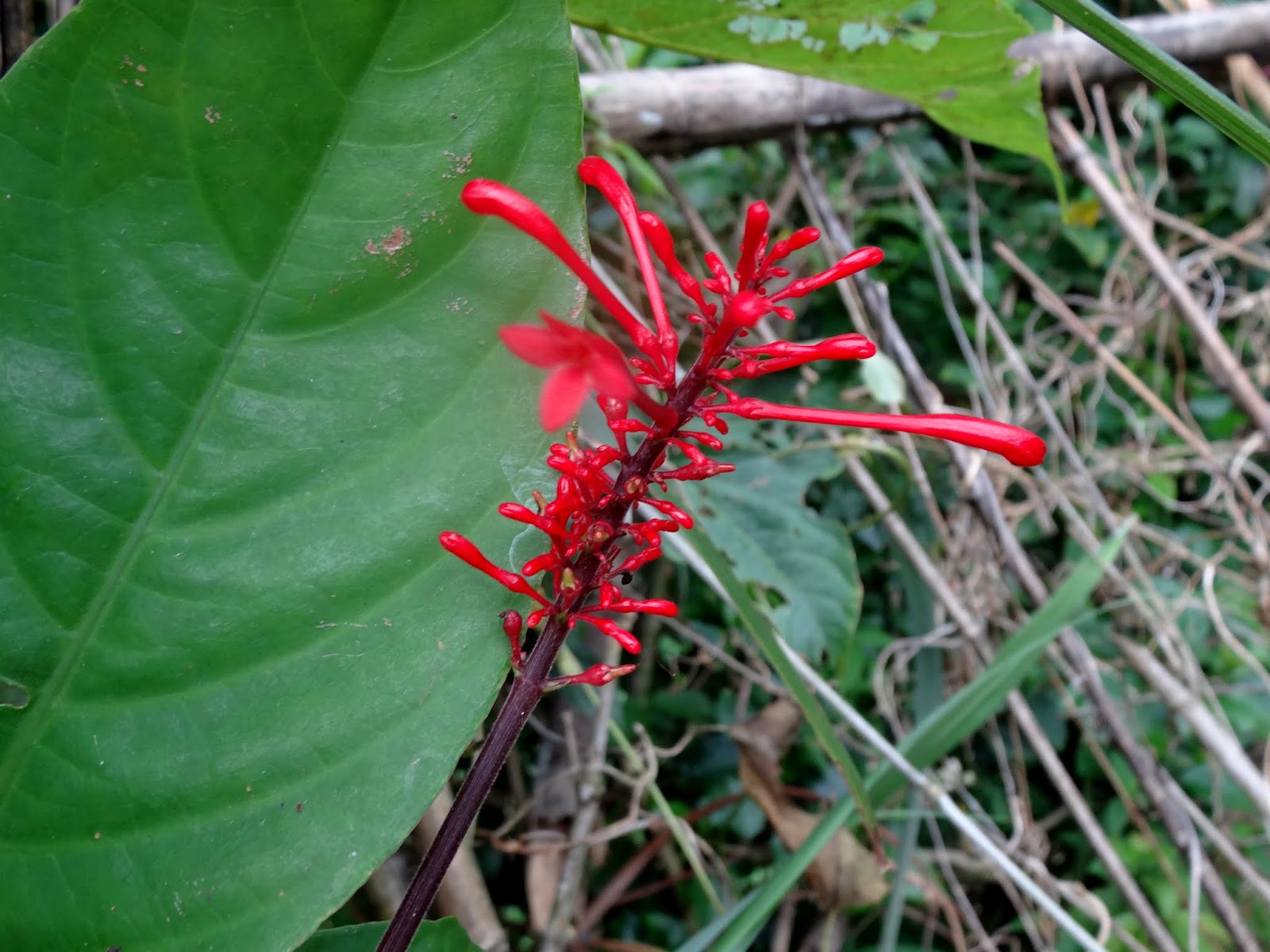 葉稍大形,對生卵狀披針形,全緣。花頂生,花梗細長赤褐色,紅色穗狀花序,