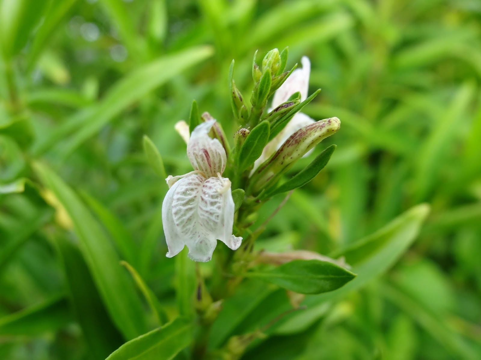 苞片都小而窄;花冠二唇形,白色或粉紅色,有紫斑;雄蕊 2 個。蒴果棒狀,無毛。