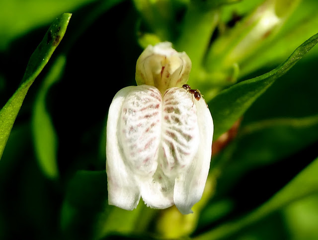 都小而窄;花冠二唇形,白色或粉紅色,有紫斑;雄蕊 2 個。