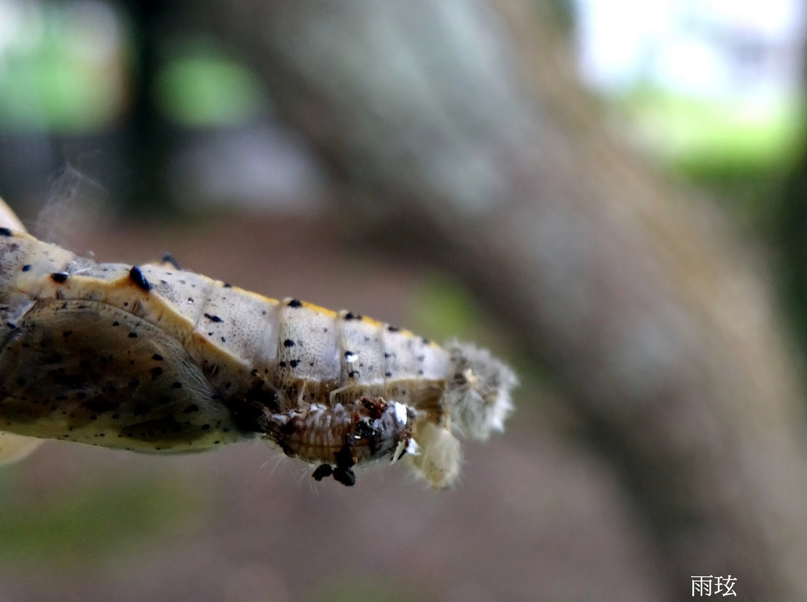 我巡視周圍幾個蛹.發現都是尾部有小孔.蛹體均已被吸食過乾掉了.