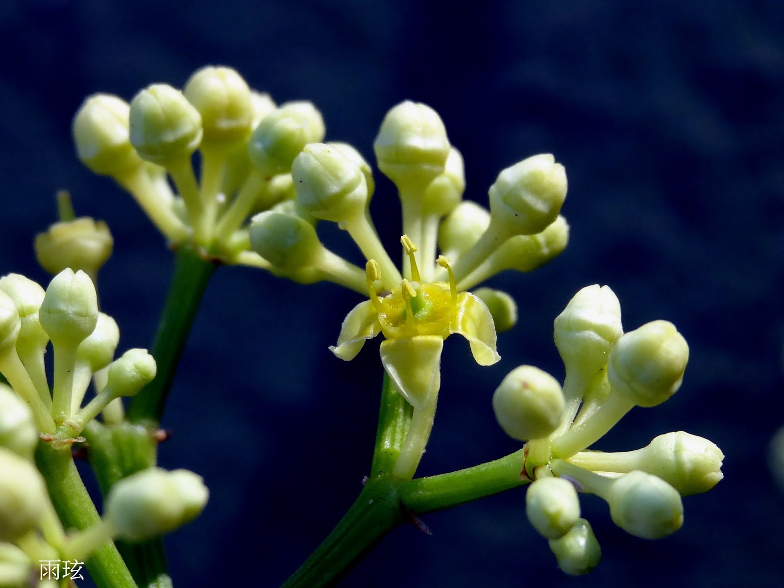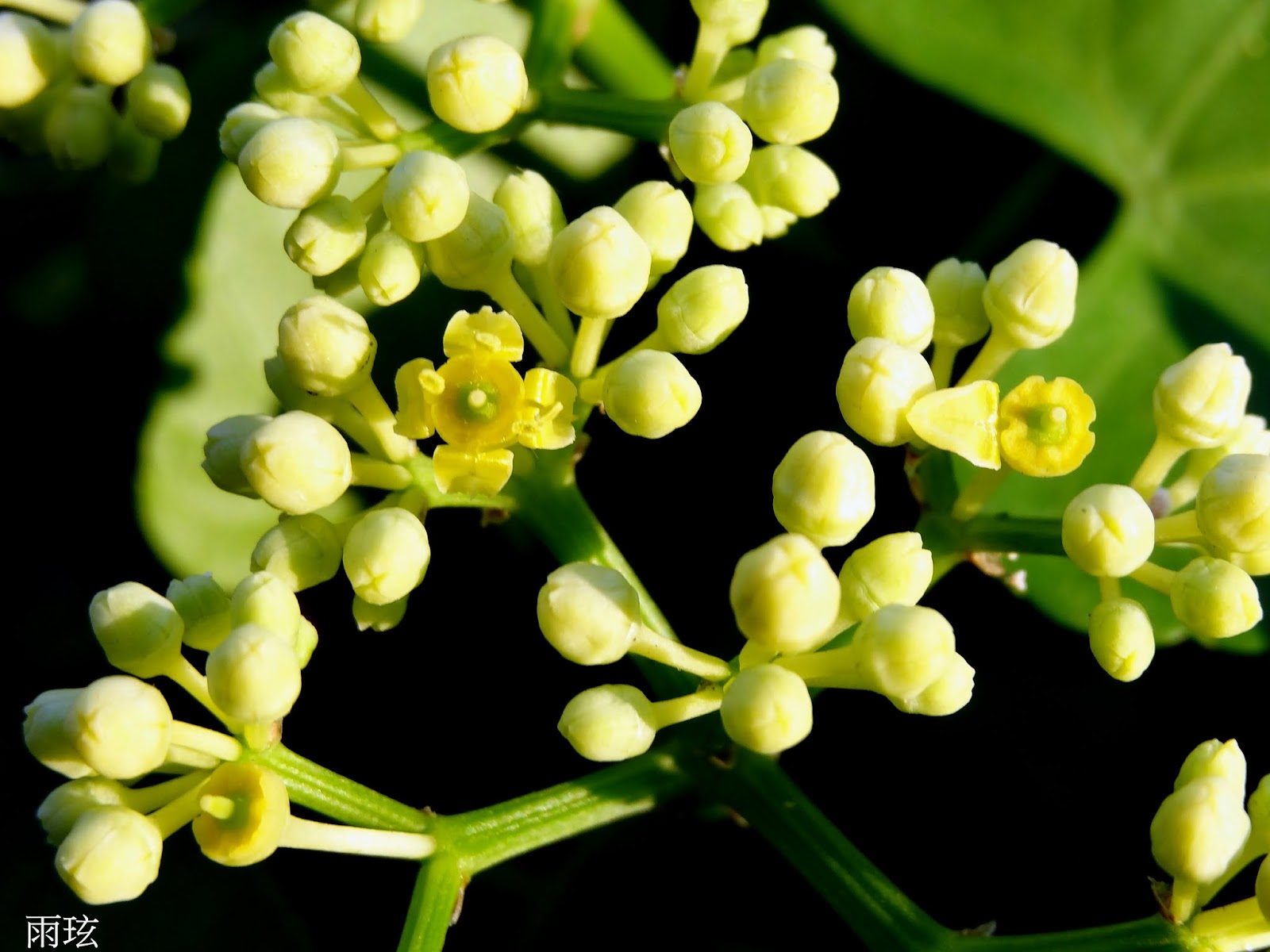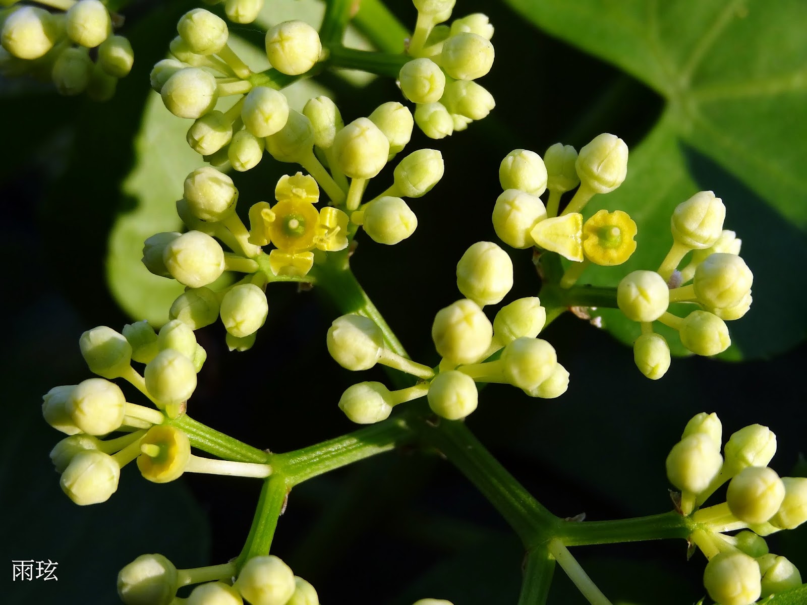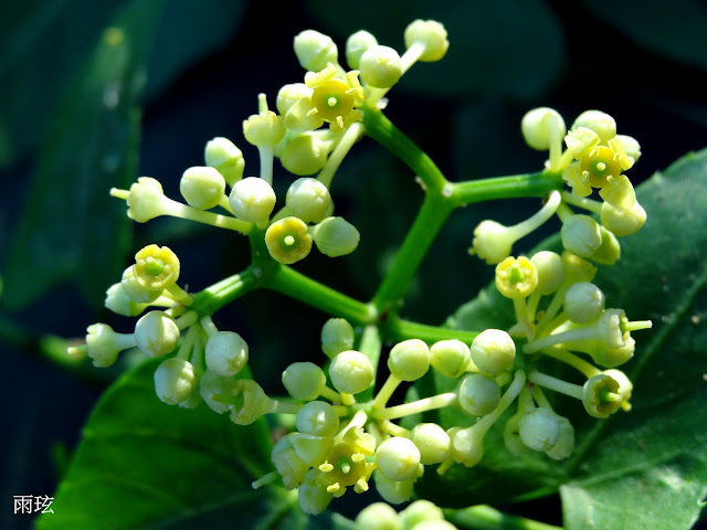 有長柄,5~10 公分。聚繖花序與葉對生,繖房狀;花小,4 瓣,淡黃色,