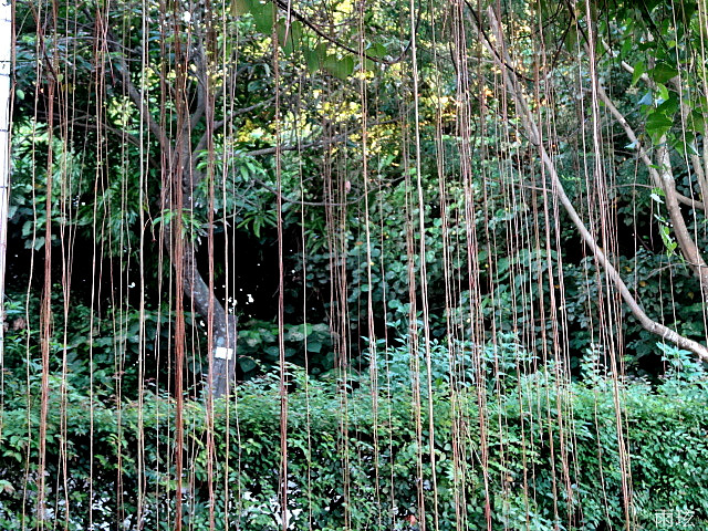 金屬光澤的紫紅色的氣根,直直懸掛於棚架下、長達數公尺,藤蔓上有淡黃色的小花.