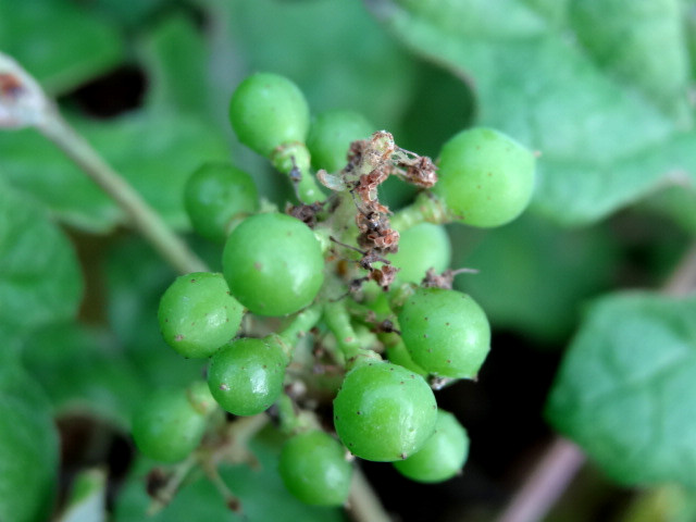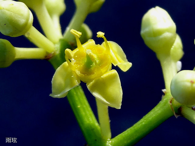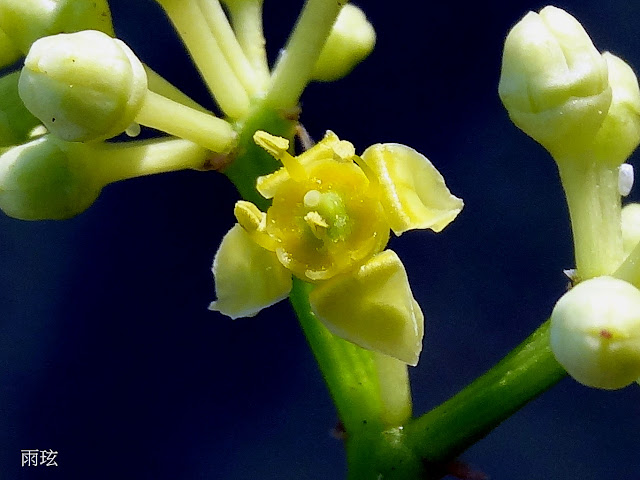 徑約 0.5 公分。漿果近球形,徑約 1 公分,青綠色,熟後變紫黑色,內有種子 1 枚。