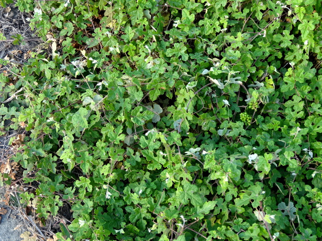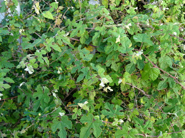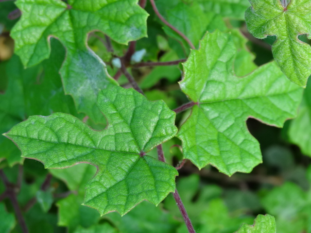 葉互生,柄長 1~3 公分,寬卵形或三角狀卵形,3 裂,裂片三角形,復不整齊狀 5 裂,