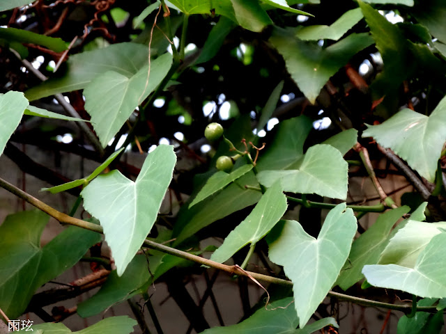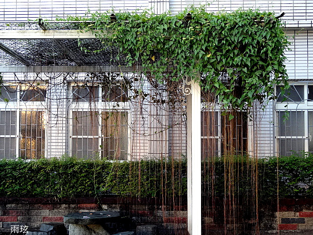 艷陽酷熱難當時躲進這個骯髒的涼亭.實屬不得以.但眼光隨即被這錦屏藤給吸引住了.