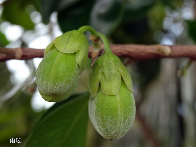 葉呈卵形及短柄,長約7厘米。葉面有革質,故底面光亮.花期為4月,果期為7月,
