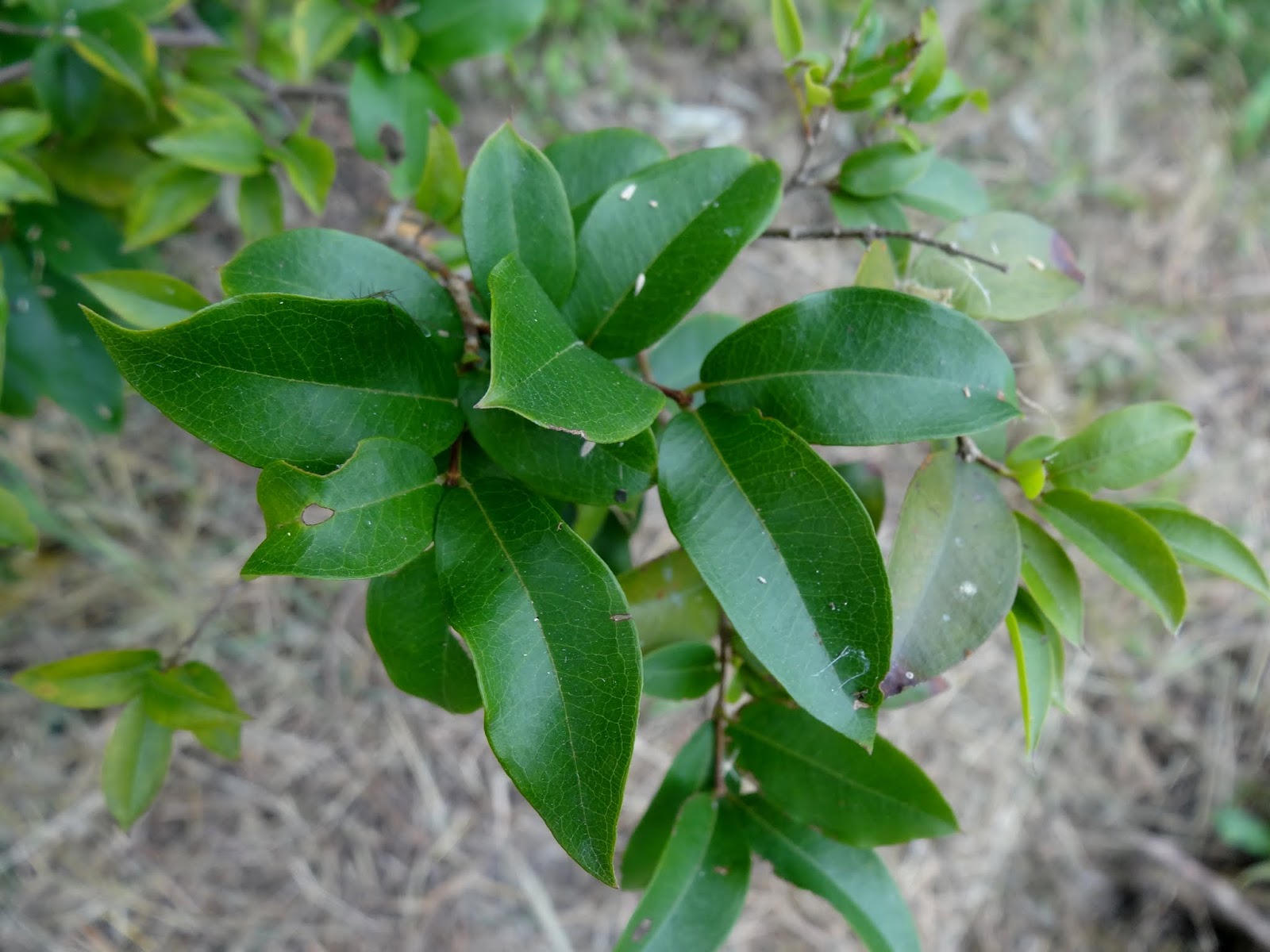 老舊樹皮會剝落。嫩葉為淺紅色,成熟葉為深綠色,葉型為披針至橢圓形,