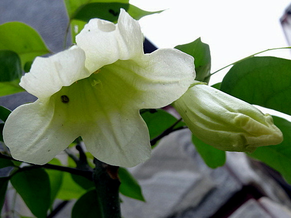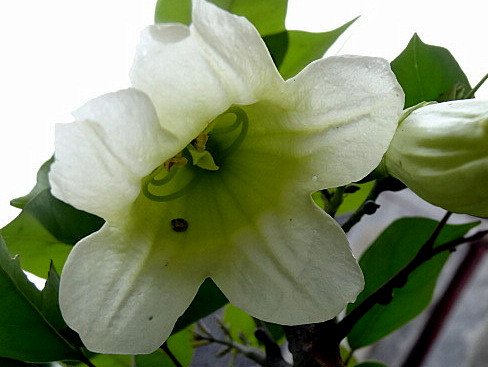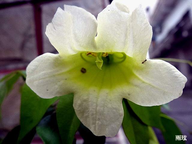 花冠鍾狀漏斗形,白色至淡黄色,長約6-8公分左右,裂片5,圓形,