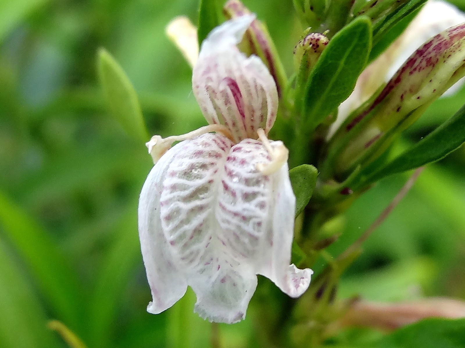 苞片都小而窄;花冠二唇形,白色或粉紅色,有紫斑;雄蕊 2 個。蒴果棒狀,無毛。