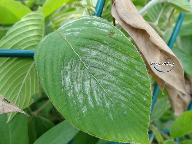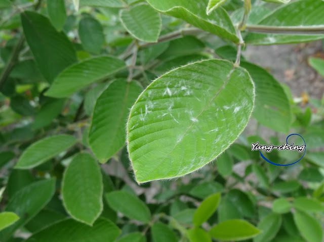 先端銳尖,基部鈍,幼葉呈表裡兩面皆密佈有白絹毛,老葉時僅葉背有毛茸,