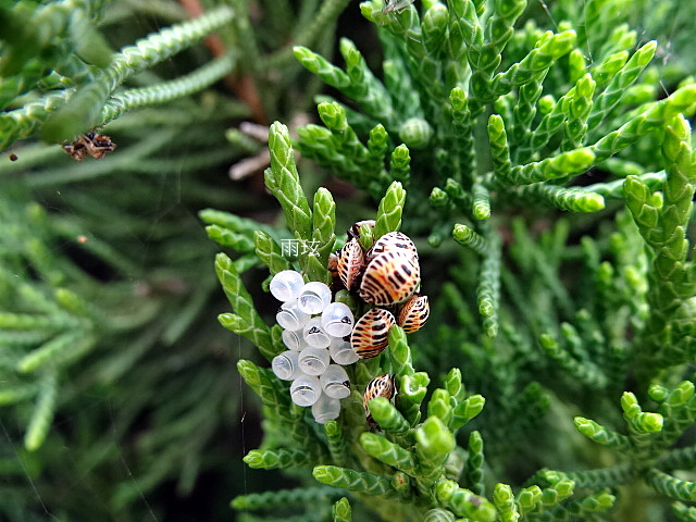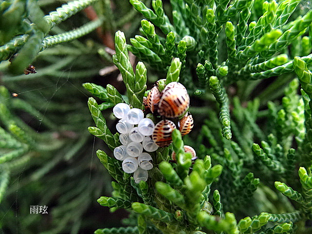 牠們黃橘黑鮮豔的顏色好可愛.群聚於空卵囊旁.