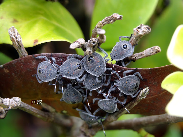 這真是幸運般奇遇.這天上午我竟能親眼目睹.這一群剛剛孵出的黃斑椿象若蟲.
