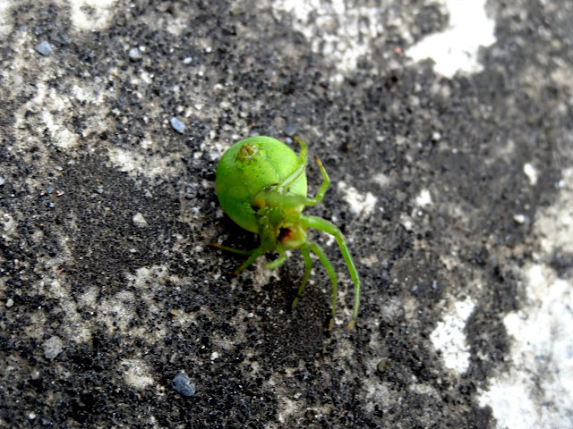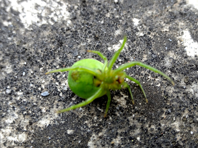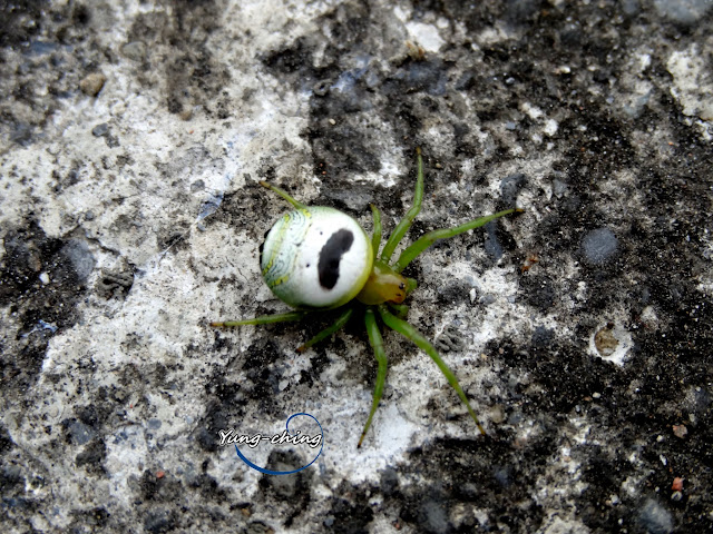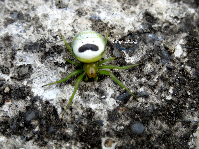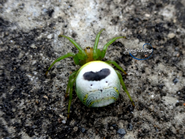 以蜘蛛來說牠算不可怕的.綠腳橘頭身體白.還有可愛的紋路.