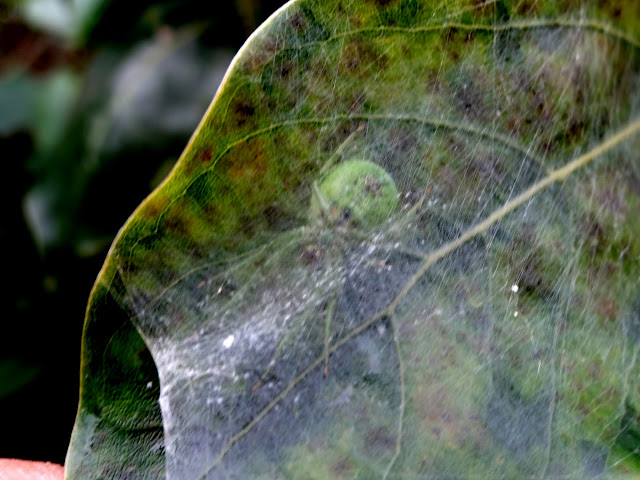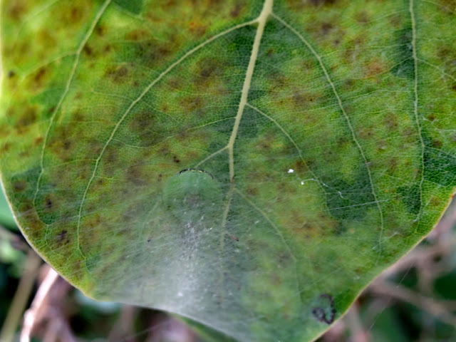 牠選在一片葉子的前端結著一層薄幕狀網.前方留有出口.說真的很難發現牠
