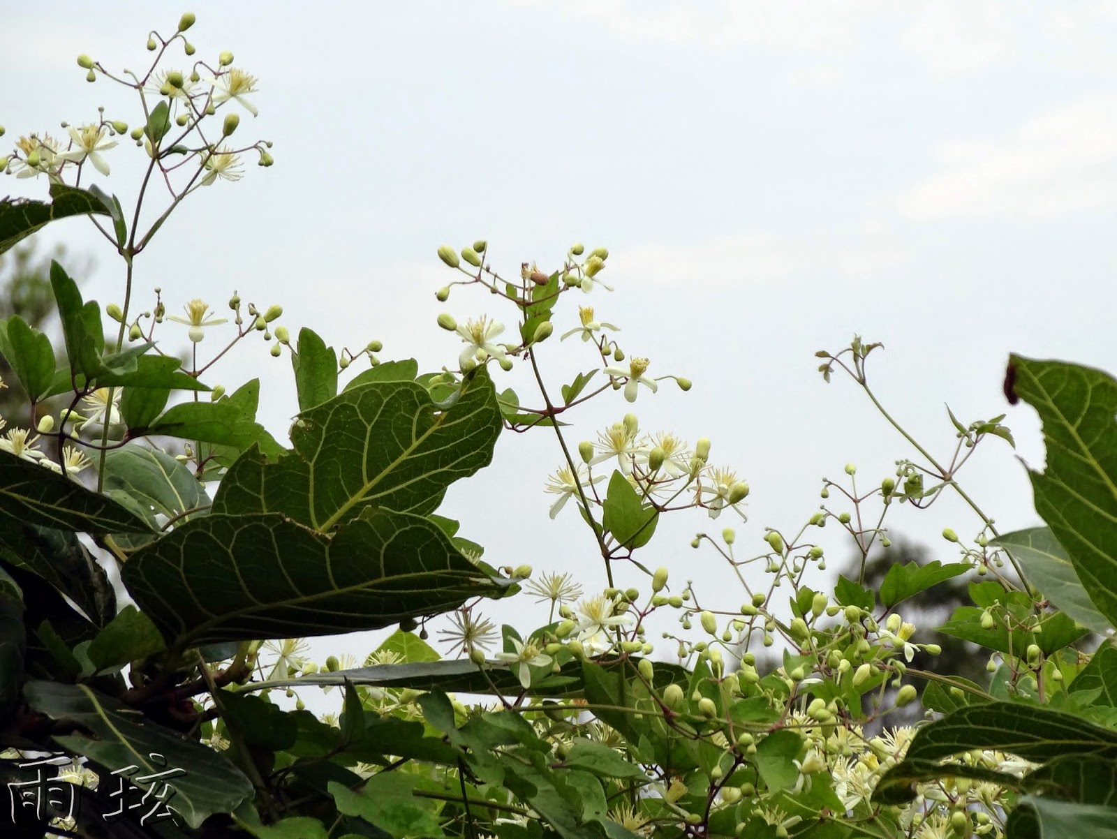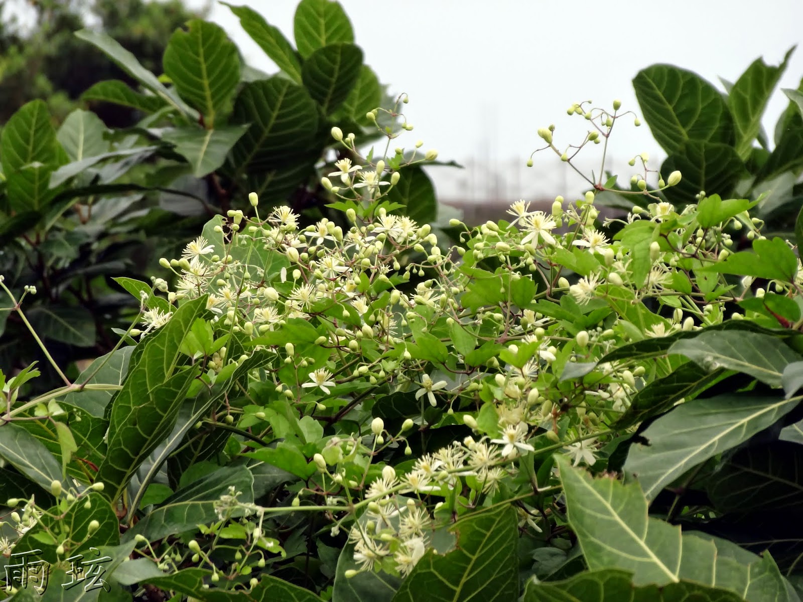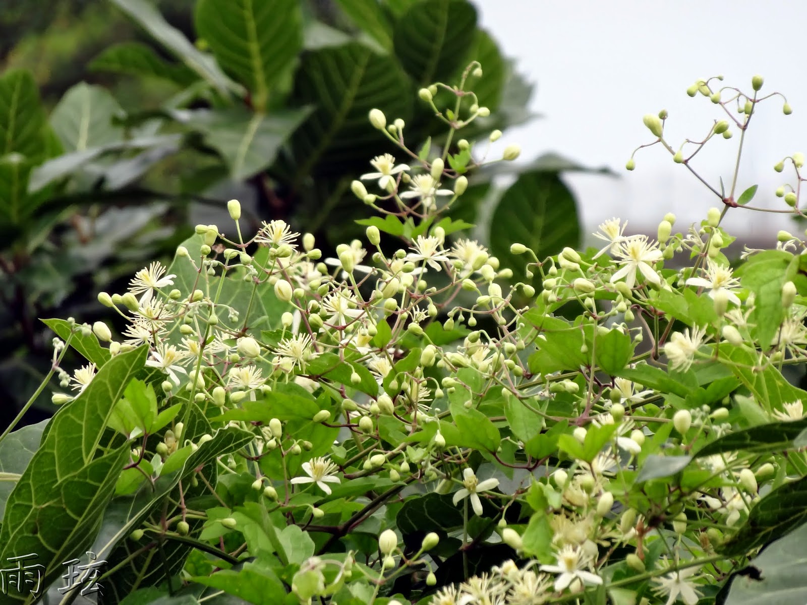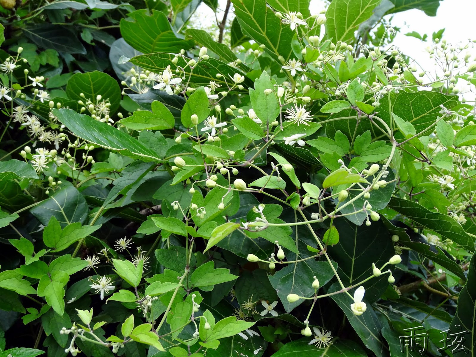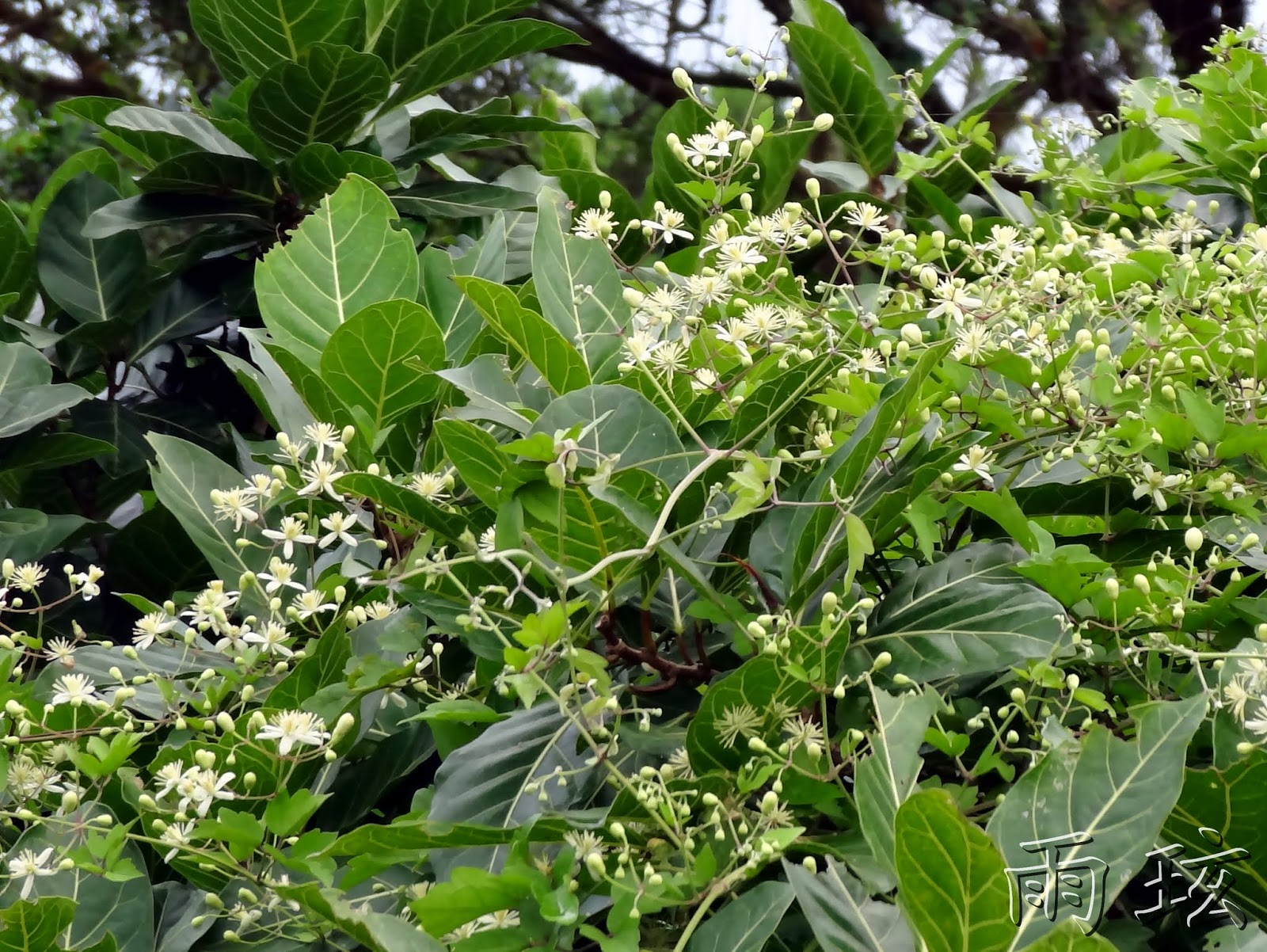 攀附垂掛著串鼻龍,開了數量頗多的白色小花;特別的是,它攀緣