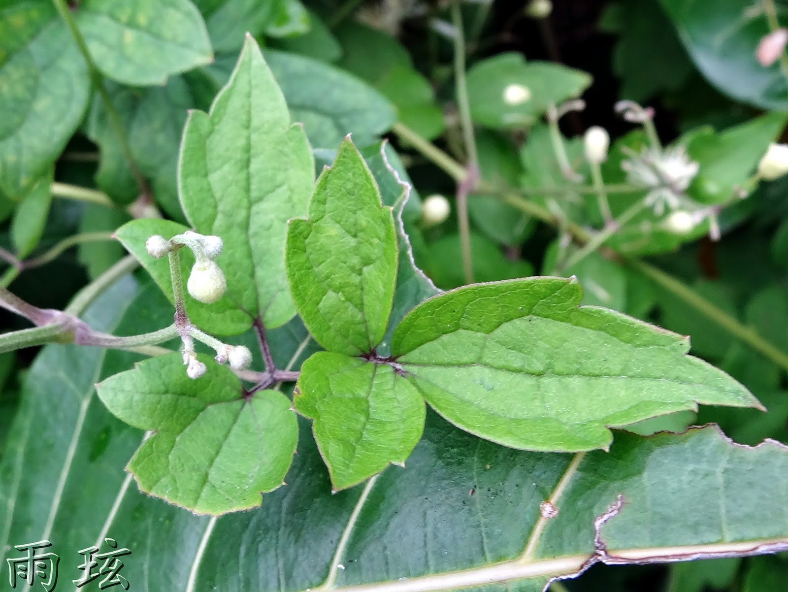 特性:多年生藤本,全株被覆粗毛,以長葉柄卷絡他物而上生。