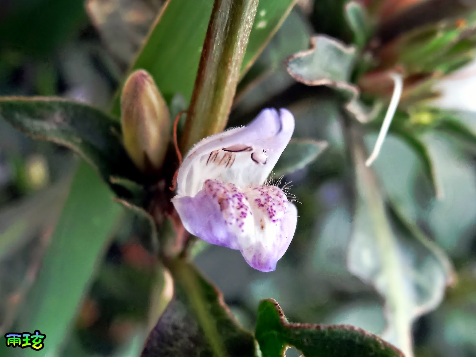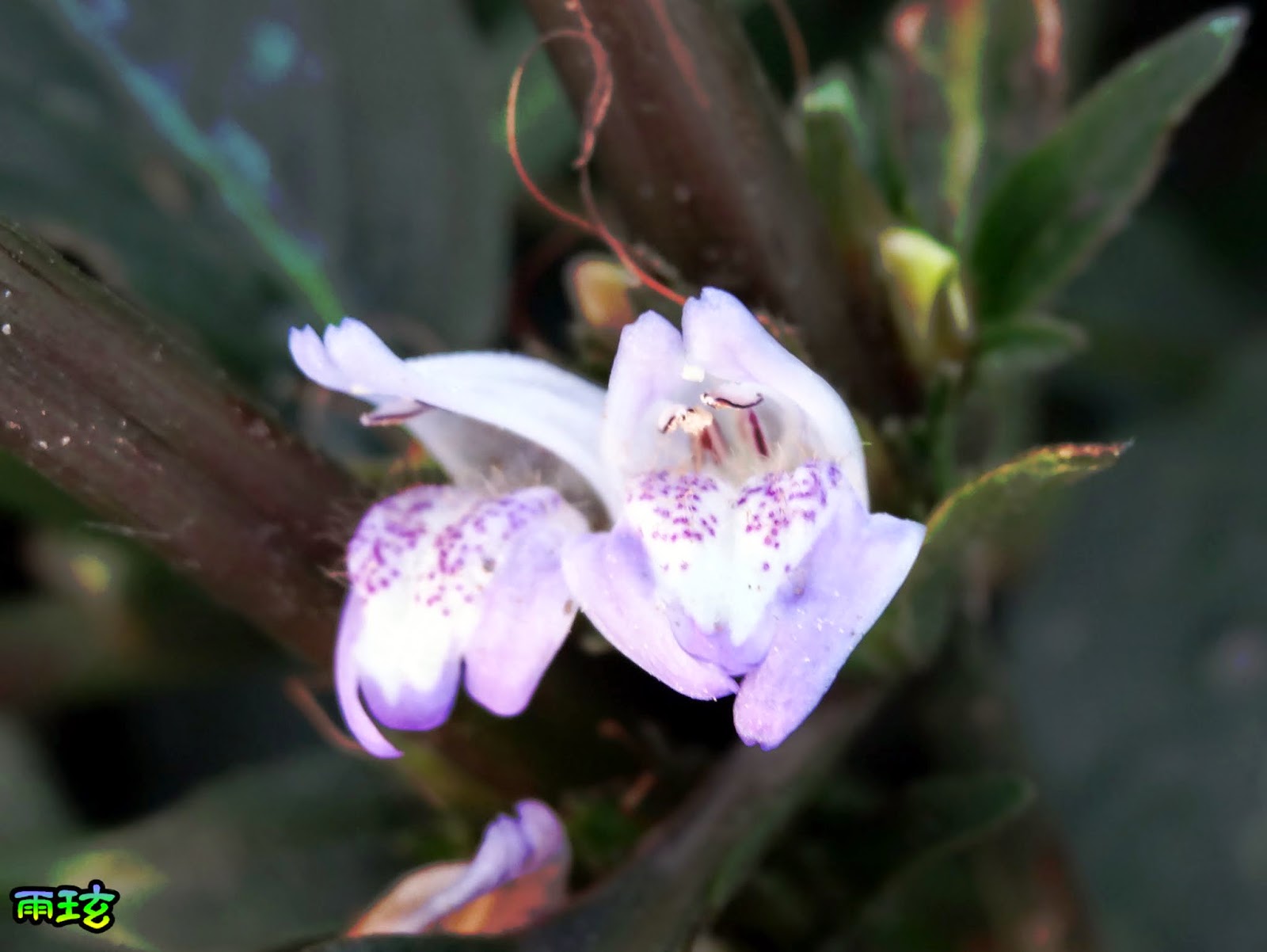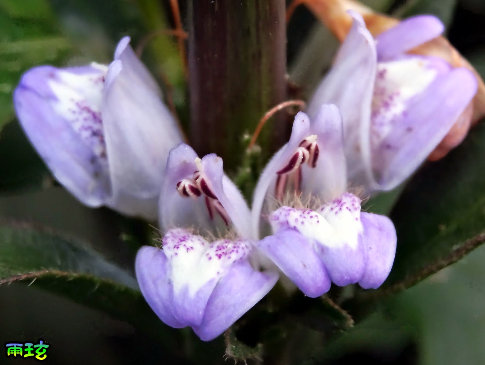 裂片線形。花冠約 2.5 公分長,瓣緣唇形上唇直立,1.5 公分長,