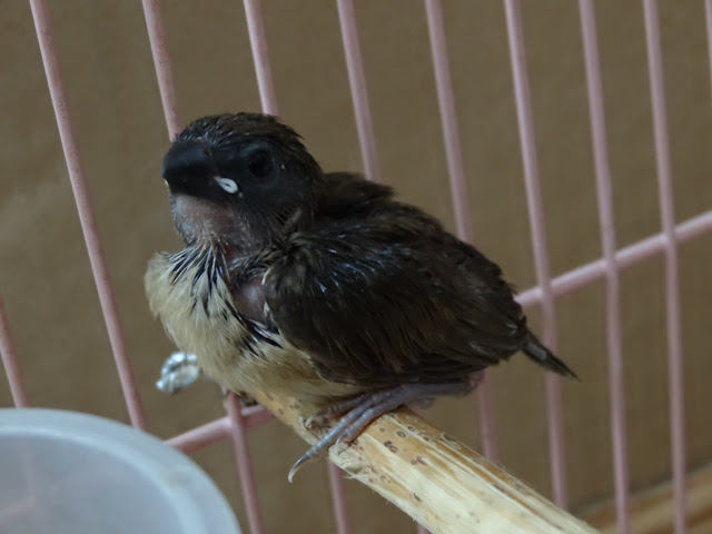 7月24日,鳥寶眾多六隻無法一手掌握,想疼牠們只好圍上圍裙,