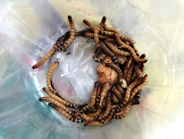 大麥蟲用地瓜與燕麥片餵得肥點,盡量挑剛換皮的軟白蟲蟲去頭腳,