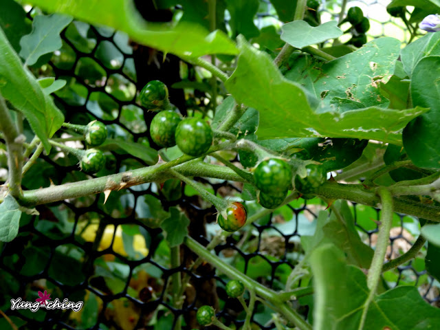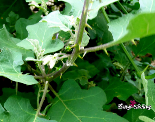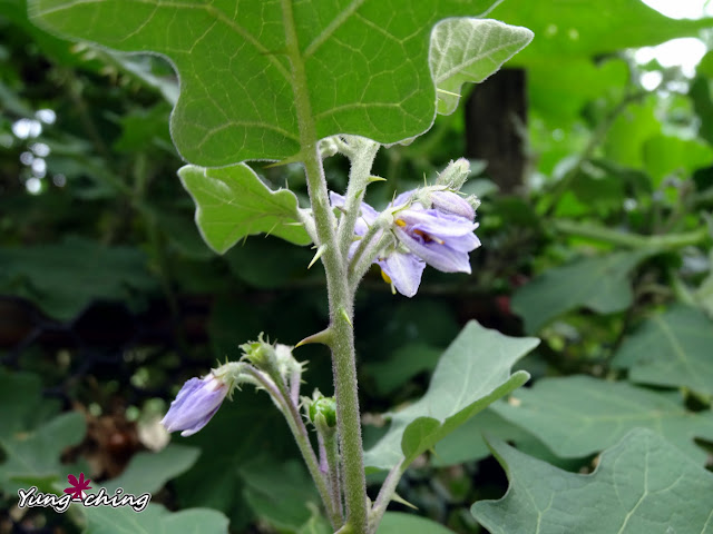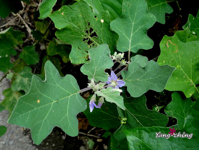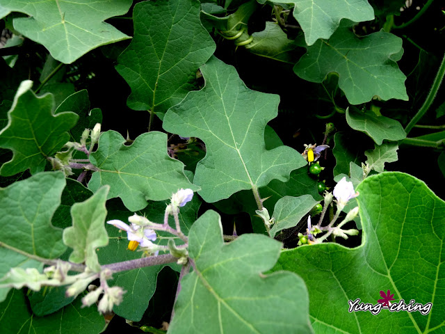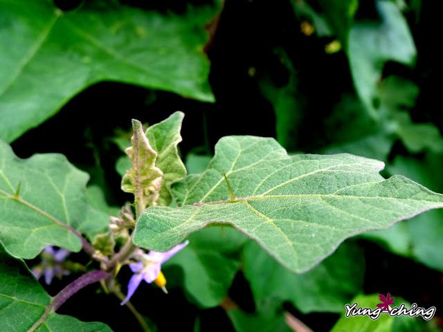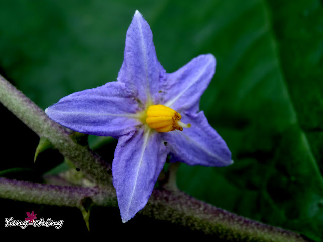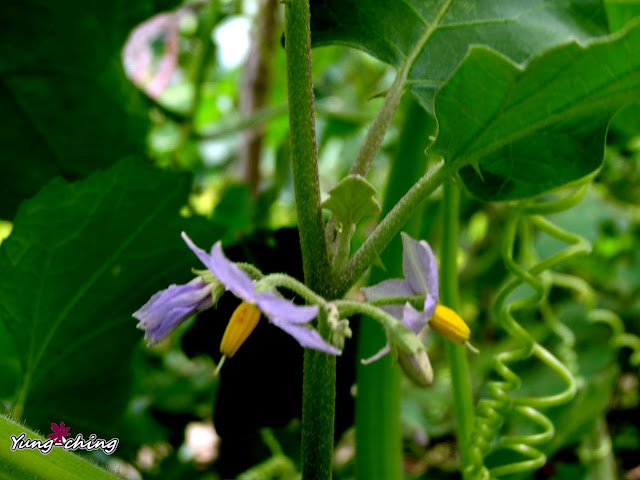 那日無意間在絲瓜棚下發現這叢印度茄,小小的紫花,標準的茄科花型。