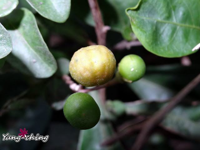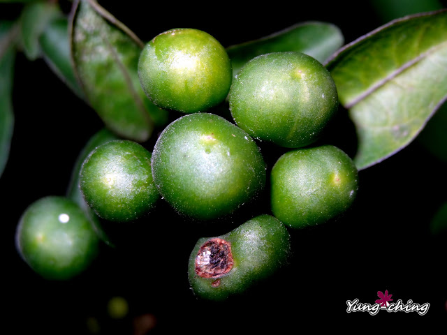 瑪瑙珠果實~球形,徑 0.7~1 公分,幼果綠色,成熟後漸轉成橙黃色、橘紅色。
