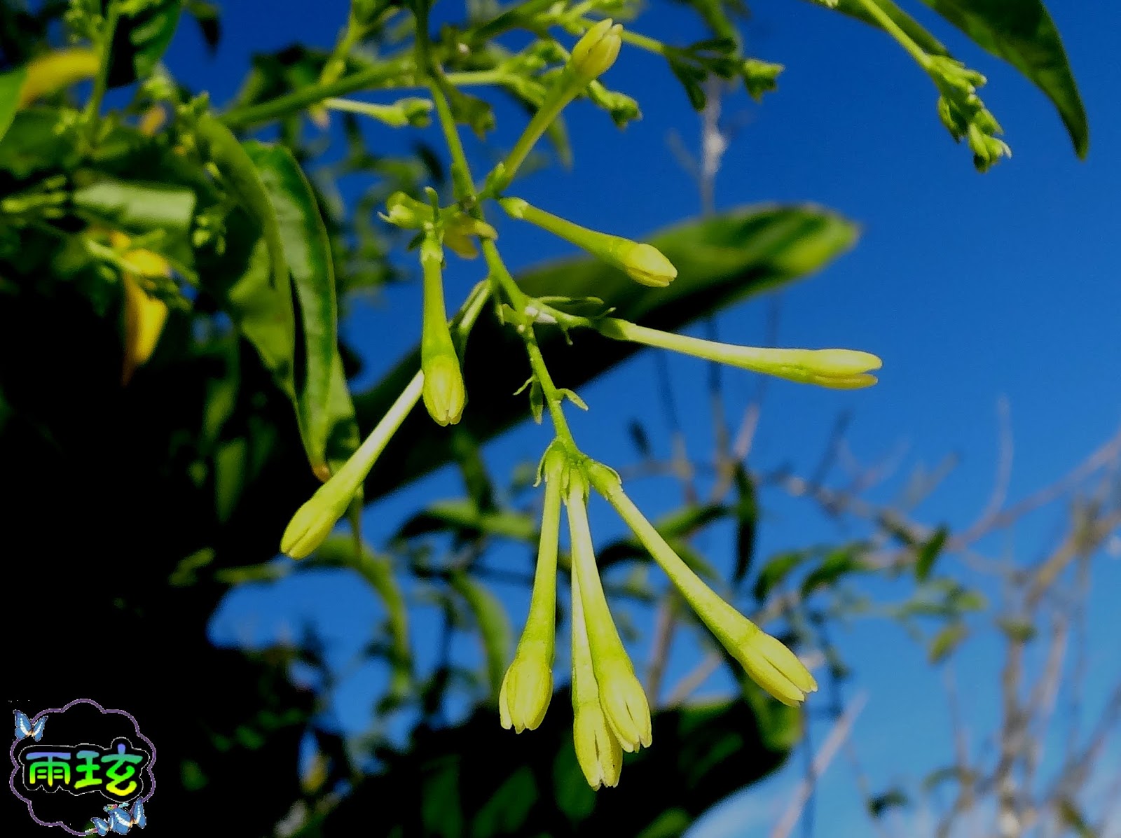 花色黃綠或綠白,花冠長筒狀,先端 5 裂,白晝含蕾閉合無香氣,夜晚綻開,