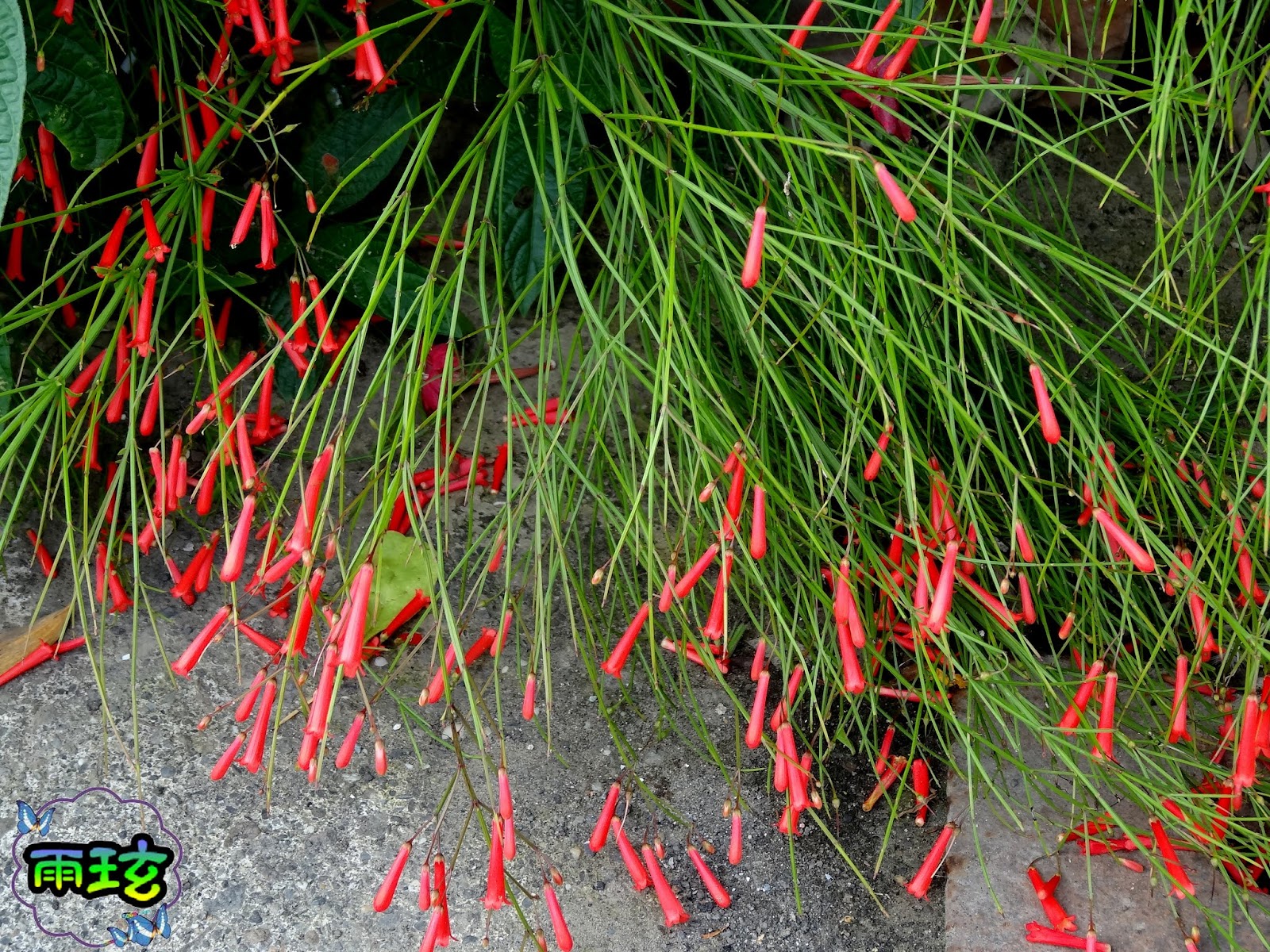炮竹紅垂吊著根根長筒狀的小紅花,果真如鞭炮串模樣,帶著十足的喜氣 !